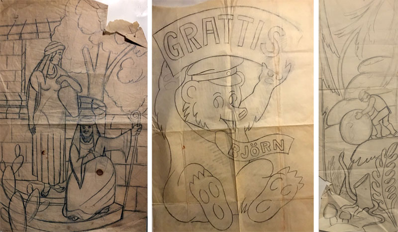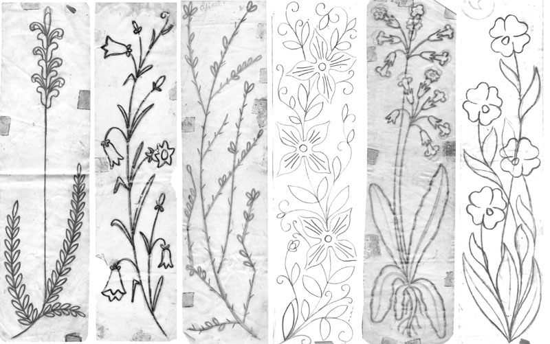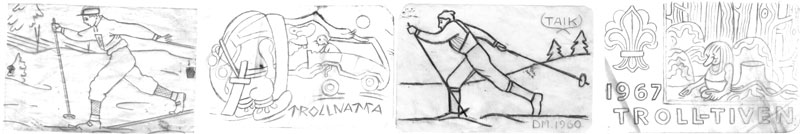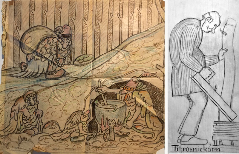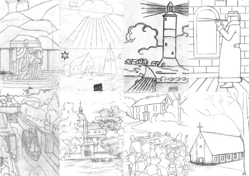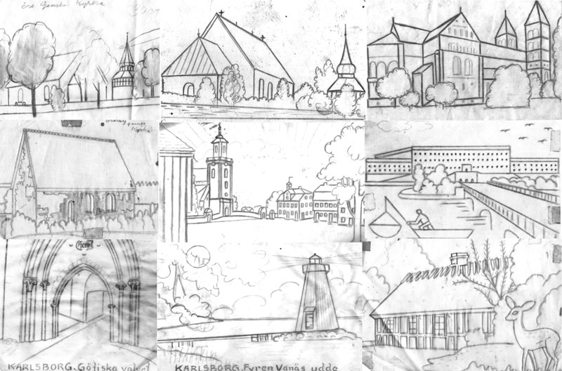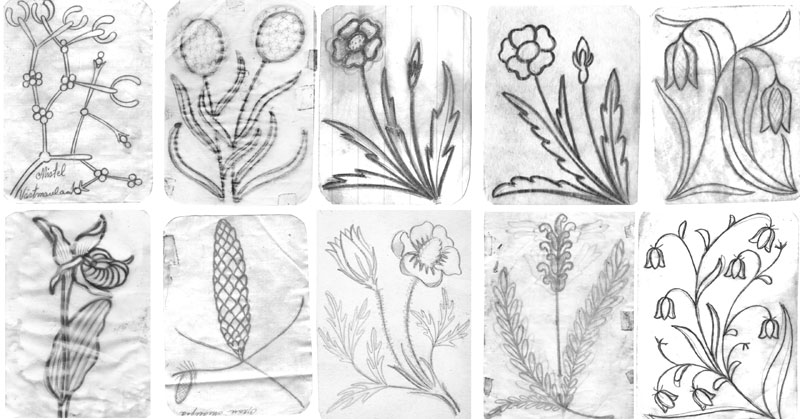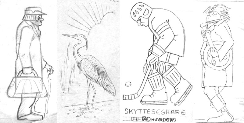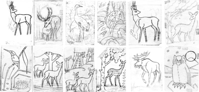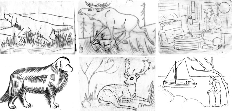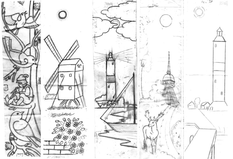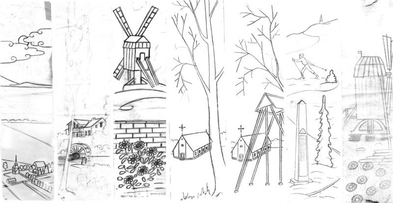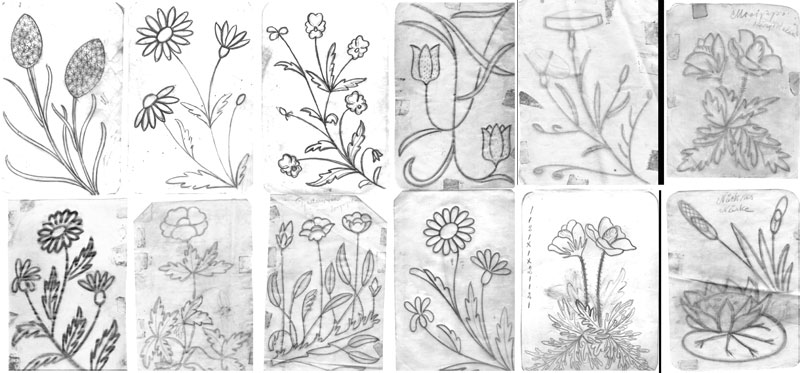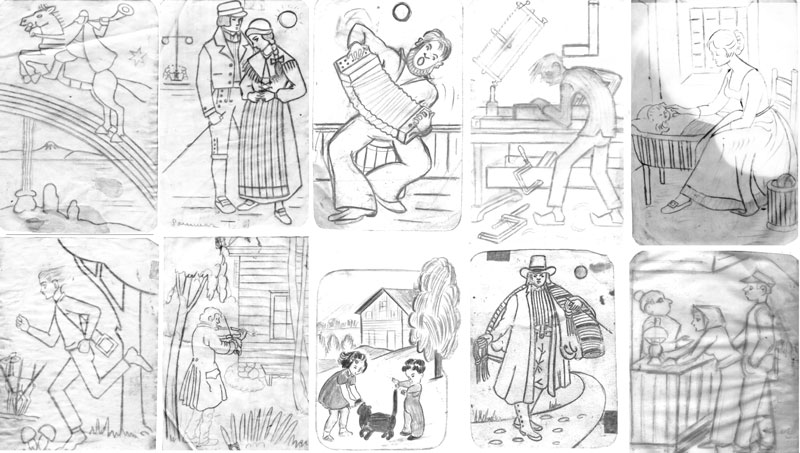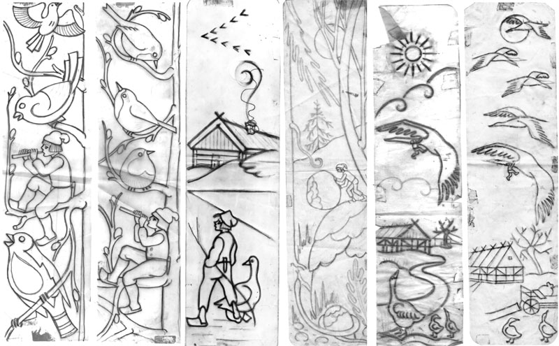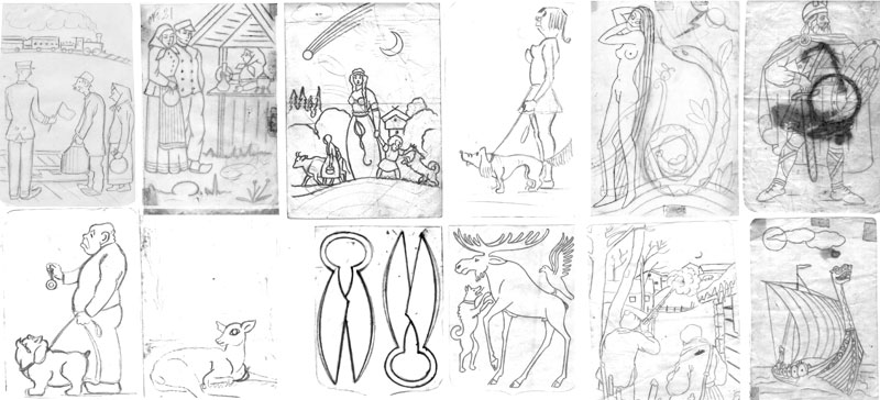 Mallar Har hittat dessa mallar och dom flesta kom att bli trätavlor i relief (270 st) eller svarta-tavlor (450 st). Vissa mallar är mer lik fristående teckningar.
